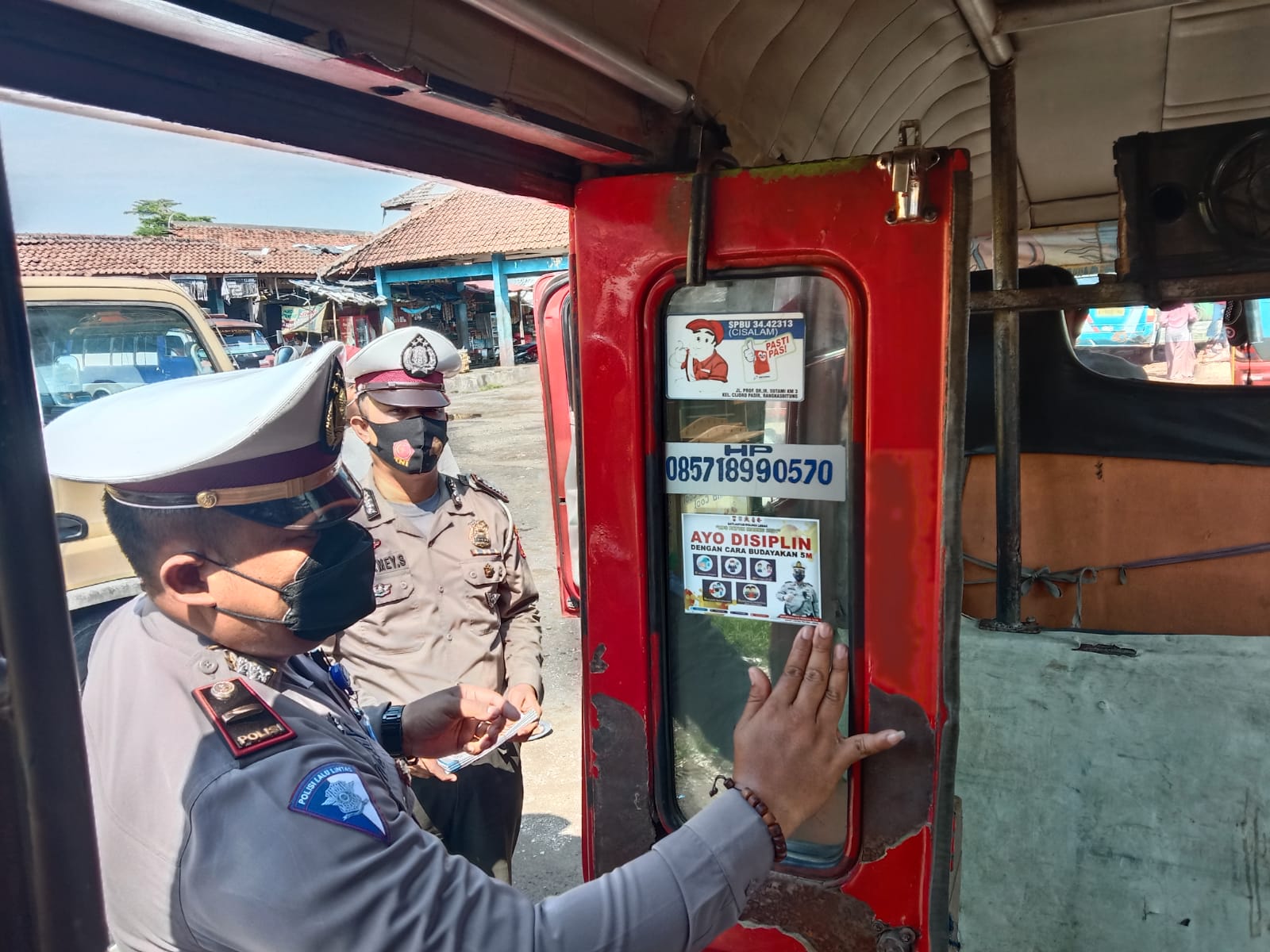 Hari Keenam Ops Patuh Maung 2021, Sat Lantas Polres Lebak Polda Banten Bagikan Masker dan Tempelkan Stiker Budayakan Prokes (Protokol kesehatan) 5 M kepada Warga masyarakat dan Supir angkutan umum di Terminal Rangkasbitung, Kecamatan Rangkasbitung, Kabupaten Lebak, Provinsi Banten, Minggu (26/9/2021).