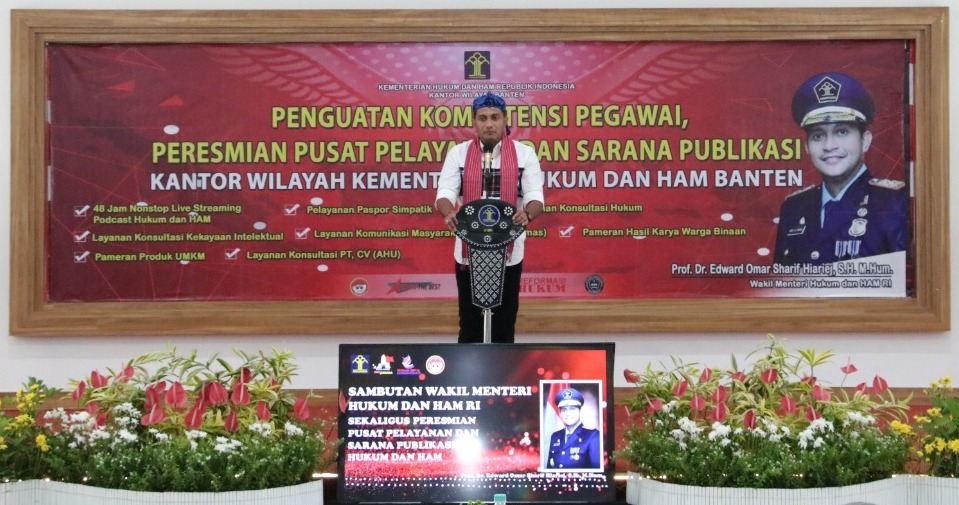 Berikan Penguatan Kompetensi kepada 1.438 pegawai di lingkungan Kantor Wilayah Kementerian Hukum dan HAM Banten, Wakil Menteri Hukum dan HAM, Edward O.S. Hiariej turut mensosialisasikan pentingnya “Anti Suap dan Pengendalian Gratifikasi” dalam upaya mewujudkan Pembangunan Zona Integritas Menuju Wilayah Bebas dari Korupsi (WBK) dan Wilayah Birokrasi Bersih dan Melayani (WBBM). (27-10-2021)