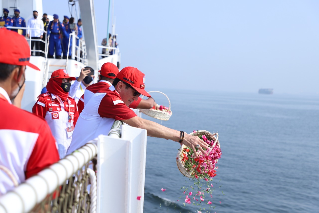 Dari atas Kapal KP Baladewa-8002, Yasonna menjelaskan kegiatan tabur bunga ini merupakan bagian dari rangkaian kegiatan HDKD Kemenkumham tahun 2021 sebagai upaya untuk mengenang para pahlawan bangsa