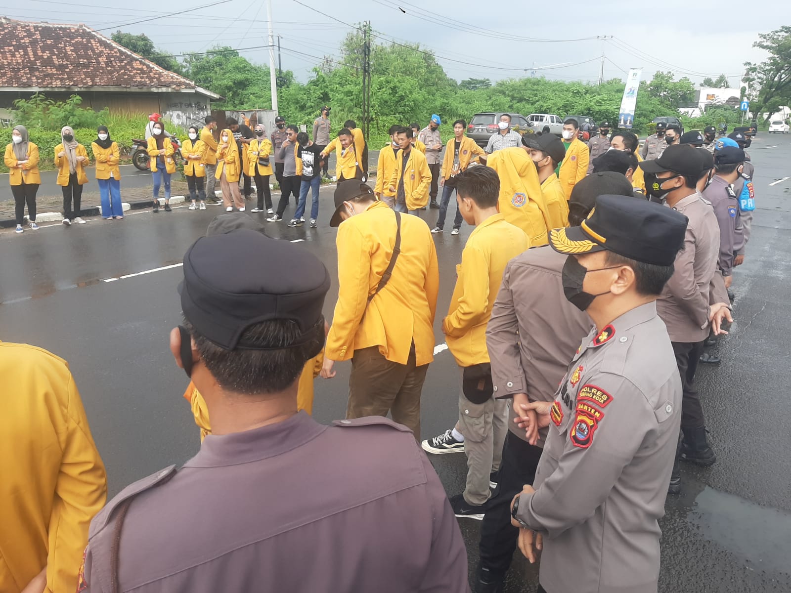 Polda Banten dan Polres Serang Kota melakukan pengamanan secara humanis aksi unjuk rasa Mahasiswa Universitas Serang Raya, di Kantor Kawasan Pusat Pemerintahan Provinsi Banten (KP3B) Jl Syekh Nawawi Al Bantani Palima Kota Serang, Kamis (28/10).