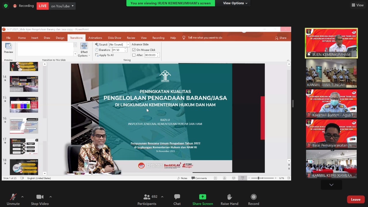 Jajaran Kantor Wilayah Kementerian Hukum dan Hak Asasi Manusia Banten mengikuti Gelaran Penyusunan Rencana Umum Pengadaan Tahun 2022 yang dilakukan secara virtual melalui aplikasi zoom meeting. Hadir Inspektur Jenderal Kemenkumham, Razilu, memberikan pemaparan materi mengenai Penguatan Peningkatan Kualitas Pengelola Pengadaan Barang/Jasa di Lingkungan Kementerian Hukum dan HAM, Selasa (16/11).