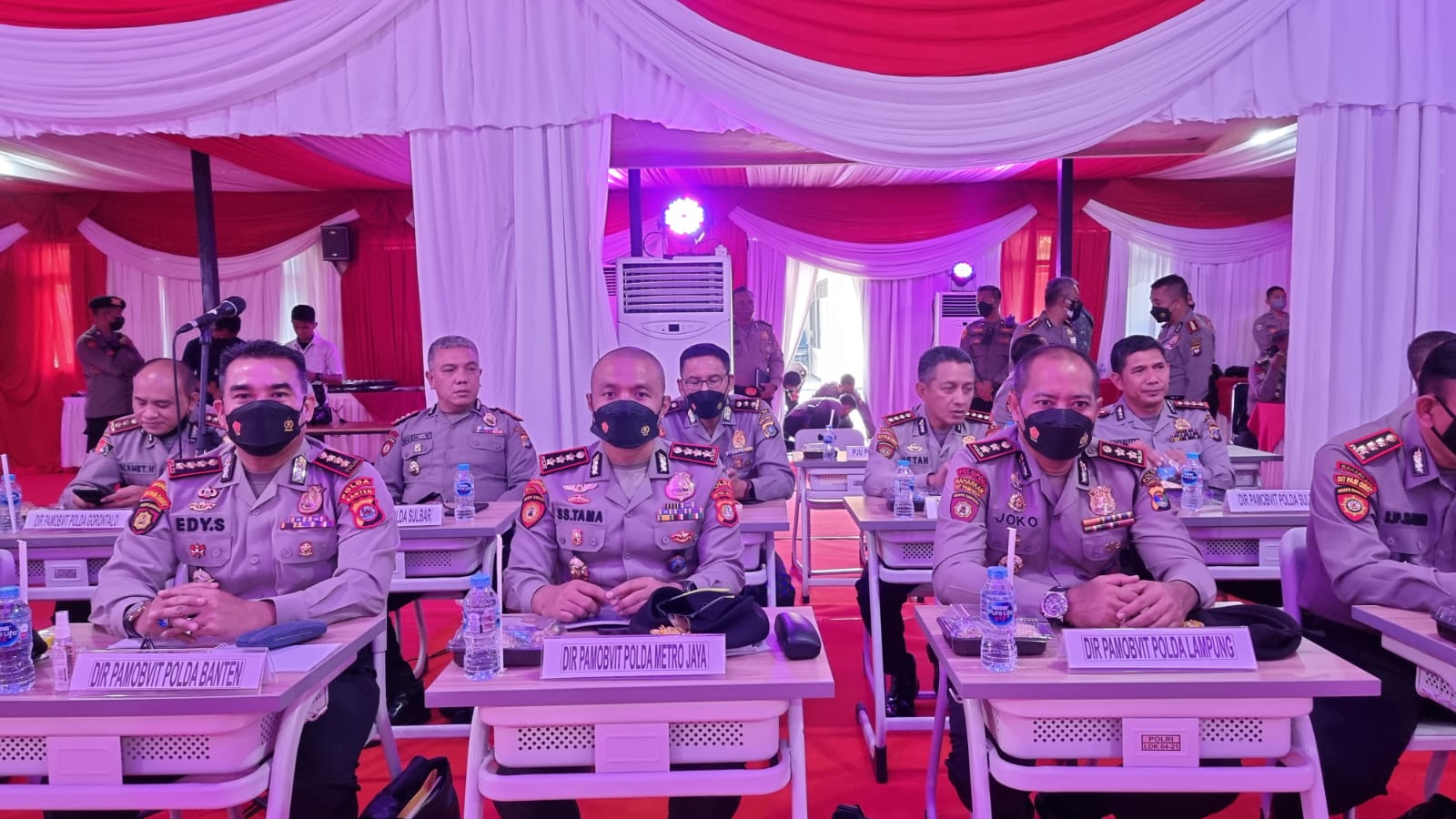 Komjen Pol Drs. Arif Sulistyanto diikuti Kakor Sabhara Baharkam Polri IJP Drs. Priyo Widyanto, Dirpamobvit Baharkam Polri KBP Rudi Antariksawan, pejabat utama Baharkam Polri serta Dirpamobvit dan Dirsamapta se-Indonesia sebagai peserta Rakernis.