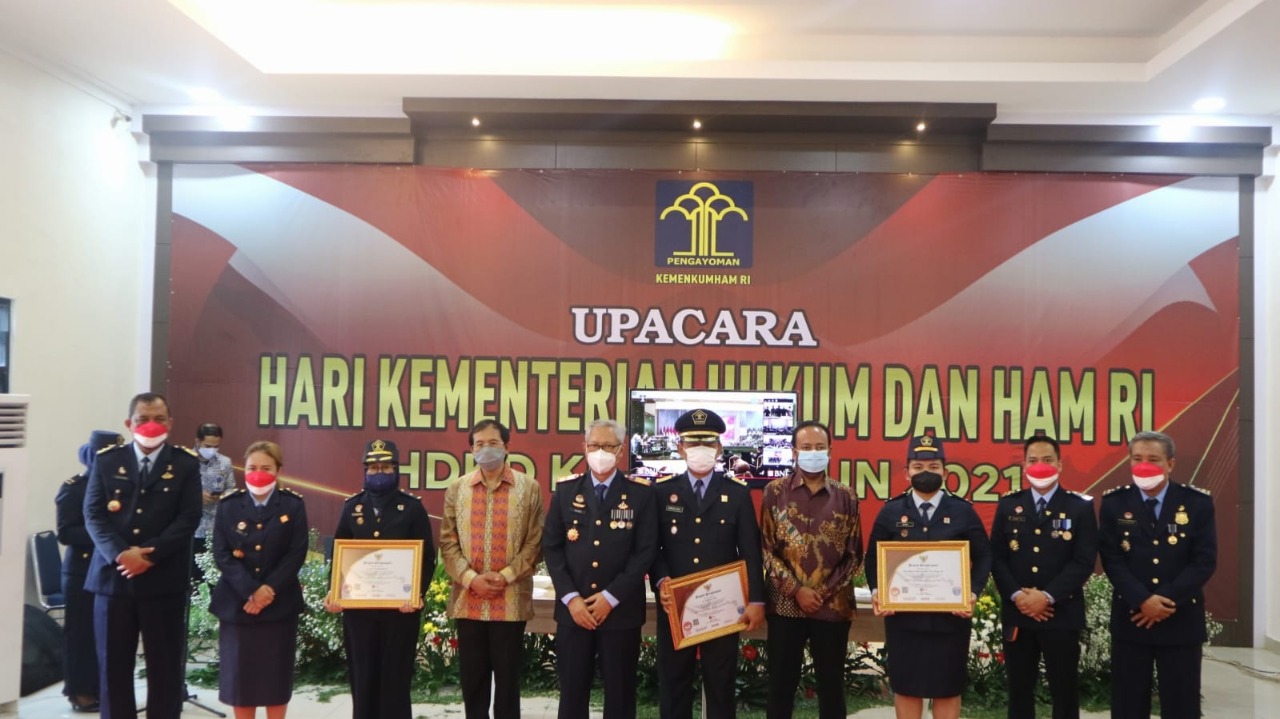Kepala Kantor Wilayah Kementerian Hukum dan HAM Banten, Agus Toyib memberikan penghargaan bagi para pejuang kemanusiaan penanganan Covid-19 di lingkungan Kantor Wilayah Kementerian Hukum dan HAM Banten. Penghargaan diberikan dalam rangkaian kegiatan Anugerah dan Tasyakuran Hari Kementerian Hukum dan HAM “HDKD ke-76 Tahun 2021” di Aula Lapas Kelas I Tangerang, Sabtu (30/10).