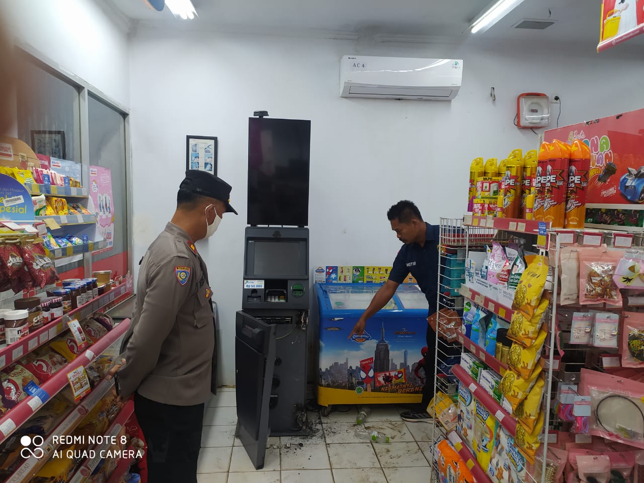 Mesin ATM atau Anjungan Tunai Mandiri yang berada di sebuah minimarket di Kelurahan Curug, Kecamatan Curug, Kota Serang, Banten, jadi sasaran dibobol kawanan maling, Selasa (23/11/2021).