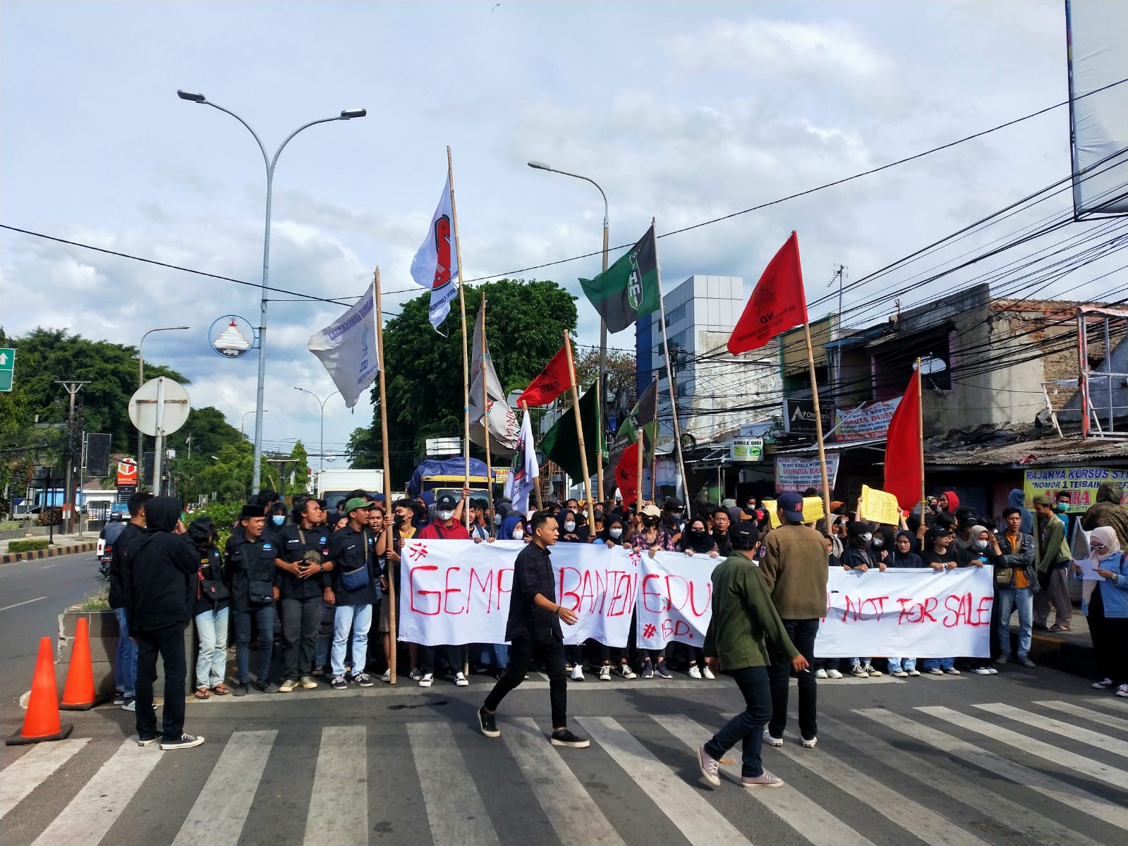 Mahasiswa yang melakukan aksi unjuk rasa di depan kampus membuat kerumunan dan memblokade jalan sehingga arus lalu lintas tersendat dan menimbulkan kemacetan.