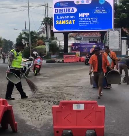 Pembersihan itu dilakukan langsung oleh Anggota Sat Lantas Polres Pandeglang, Bripka Ginanjar beserta personel Satlantas lainnya dan dibantu Petugas kebersihan Kabupaten Pandeglang membersihkan pasir dan kerikil yang berserakan dijalan raya Alun alun Kabupaten Pandeglang.
