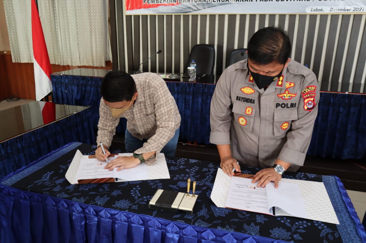 Kapolres Lebak Polda Banten AKBP Teddy Rayendra,SIK,M.I.K. dan Pimpinan Cabang Bank BRI Cabang Rangkasbitung Sdr. Riki Rinda Sakti menandatangani MOU tentang Pemberian Bantuan Pengamanan pada Obyek Vital dan Obyek Vital Tertentu yang disaksikan oleh Kasat Samapta Polres Lebak dan Personil Polres Lebak.