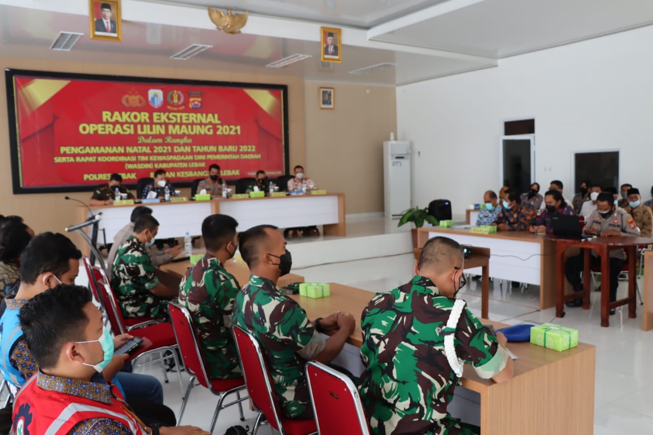 “Hari ini kita Polres Lebak bersama Forkopimda Lebak dan Instansi terkait menggelar Rapat Eksternal Ops lilin Maung 2021 yang membahas tentang Persiapan Pengamanan Natal dan Tahun Baru karena pada Pengamanan ini kita masih dalam kondisi Pandemi Covid-19 dan Kabupaten Lebak masih menerapkan Aturan PPKM Level 2,” ujar Roby.