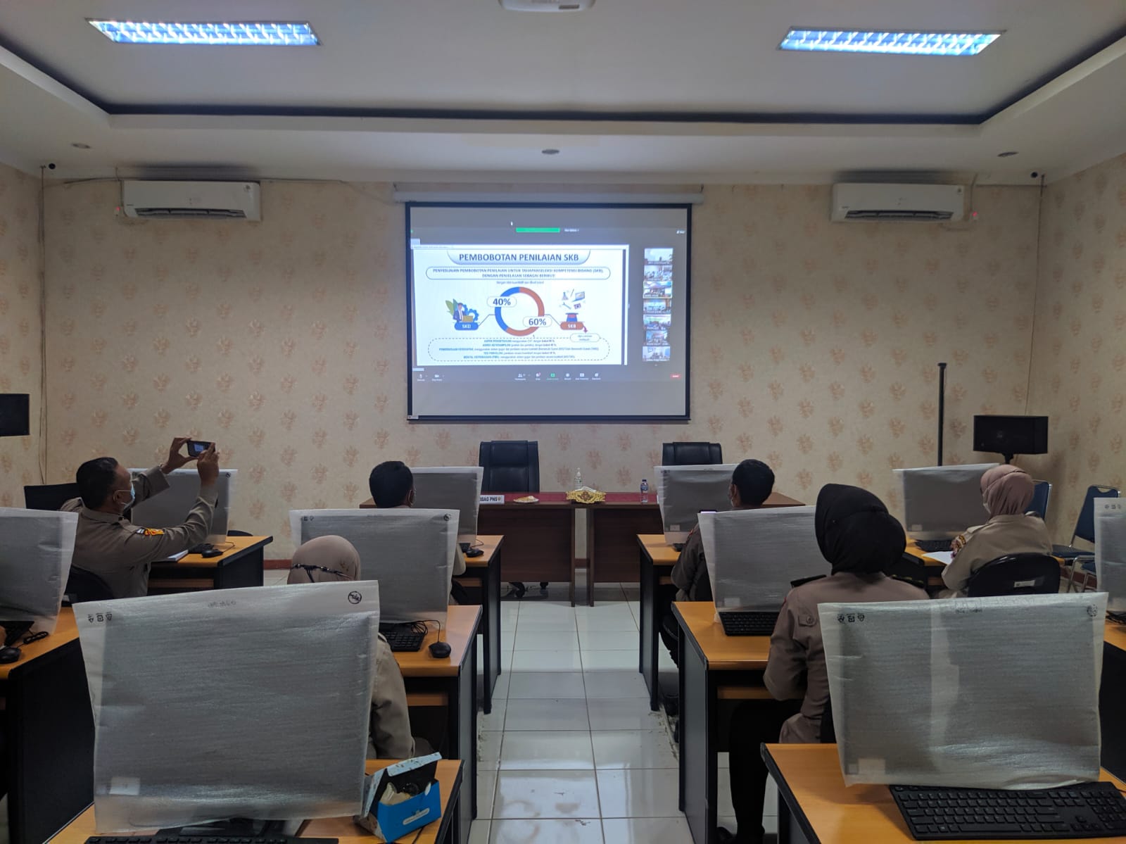 Kepala sub bagian pegawai negeri sipil Polda Banten Pembina Basunjaya Diputra beserta tim penguji menghadiri kegiatan gladi dan arahan teknis dalam rangka ujian seleksi kompetensi bidang (SKB) calon pegawai negeri sipil (CPNS) Polri melalui zoom meeting di Gedung Assessment Center Polda Banten pada Rabu (01/12).