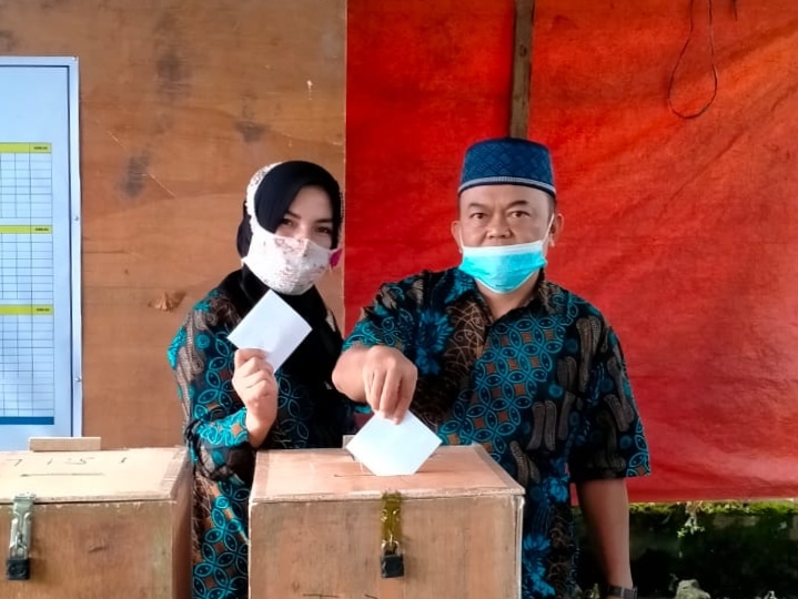 Pelaksanaan Pilkades tetap menerapkan Protokol Kesehatan Covid-19. Semua warga yang memberikan hak suaranya mencuci tangan dan menggunakan masker. (Elp)