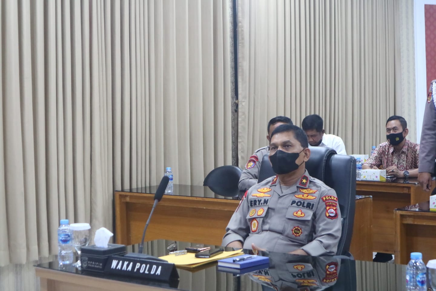 Wakapolda Banten Brigjen Pol Drs. Ery Nursatari mengikuti Analisa dan Evaluasi (Anev) lanjutan capaian vaksinasi yang dipimpin oleh Wakapolri Komjen Pol Gatot Eddy Pramono melalui Zoom Meeting di Ruang Vicon Polda Banten pada Jumat (21/01).