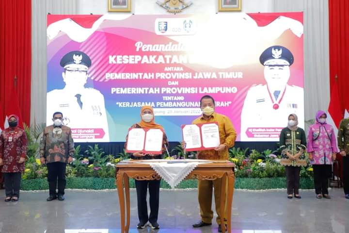 MoU berisi kerja sama di bidang pertanian, tanaman pangan dan hortikultura, peternakan dan kesehatan hewan, perkebunan, perindustrian dan perdagangan tersebut ditandatangani Gubernur Jawa Timur Khofifah Indar Parawansa dan Gubernur Lampung Arinal Djunaidi, di Mahan Agung Lampung, Jumat (28/1/2022).