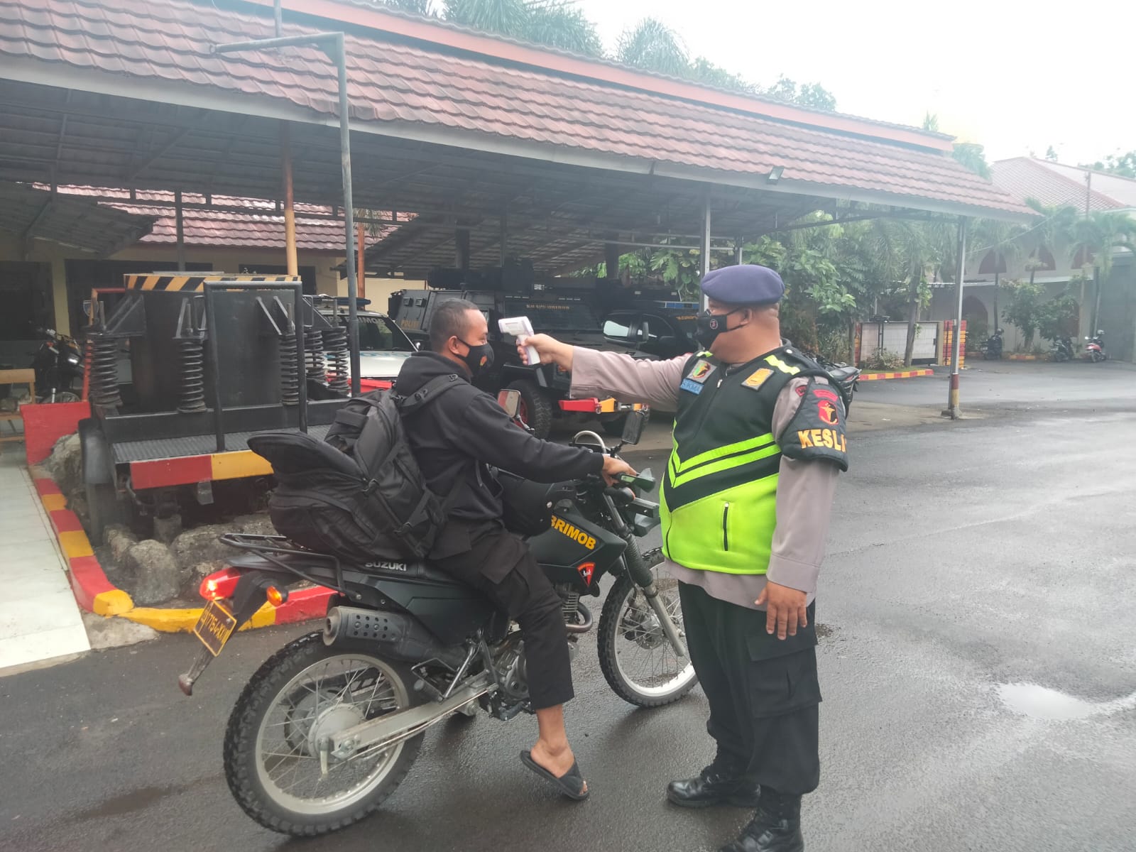 Dalam upaya menekan angka penyebaran Covid-19, personel provos dan tim kesehatan jasmani (Kesjas) Satuan Brigade mobil (Satbrimob) Polda Banten melakukan pengecekan suhu tubuh menggunakan Thermogun kepada semua personel Satbrimob, anggota Bhayangkari dan tamu yang masuk ke Mako Satbrimob Polda Banten, pada Jumat (07/01).