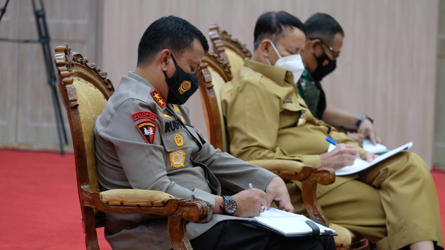 Kapolda Banten Irjen Pol Prof. Dr. Rudy Heriyanto mengikuti Video Conference (Vicon) terkait penanganan Covid-19 varian Omicron yang disampaikan langsung oleh Presiden RI Ir. H. Joko Widodo di Pendopo Gubernur Banten pada Senin (07/02).