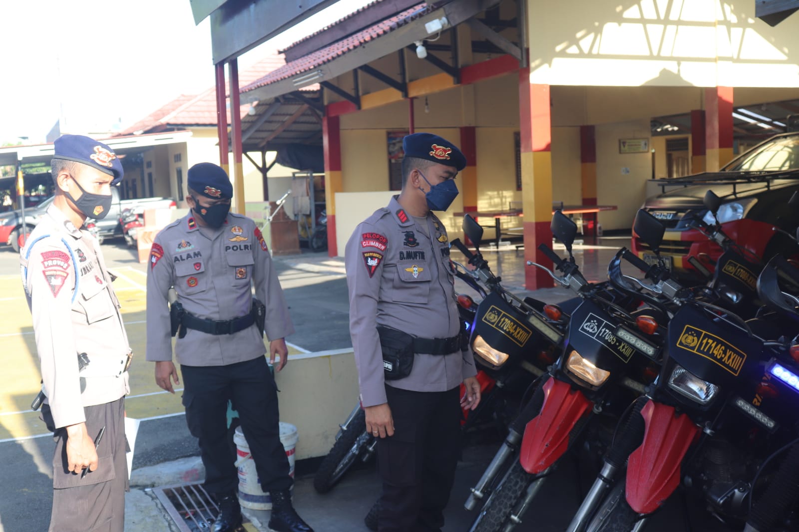 Dalam pemeriksaanya, Pasimin Batalyon A Pelopor Ipda Alam bersama Provos Batalyon A Pelopor memeriksa perlengkapan personel dan kendaraan dinas yang siap operasional.