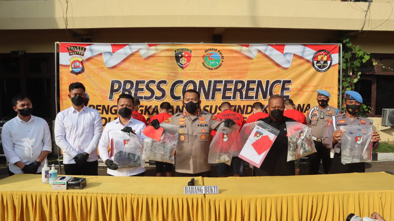 Pada kegiatan Press Conference Kapolres mengumumkan telah menetapkan 6 tersangka, “Bedasarkan hasil penyidikan Polres Cilegon menetapkan 6 tersangka yaitu ASB, HY, M, JP, FA dan DA yang merupakan Tahanan Rutan Polres Cilegon Polda Banten dengan barang bukti 1 buah jaos, 1 buah celana pendek, 1 buah gulungan karpet, 2 buah botol plastik air dan bongkahan semen,” ujar AKBP Sigit Haryono.