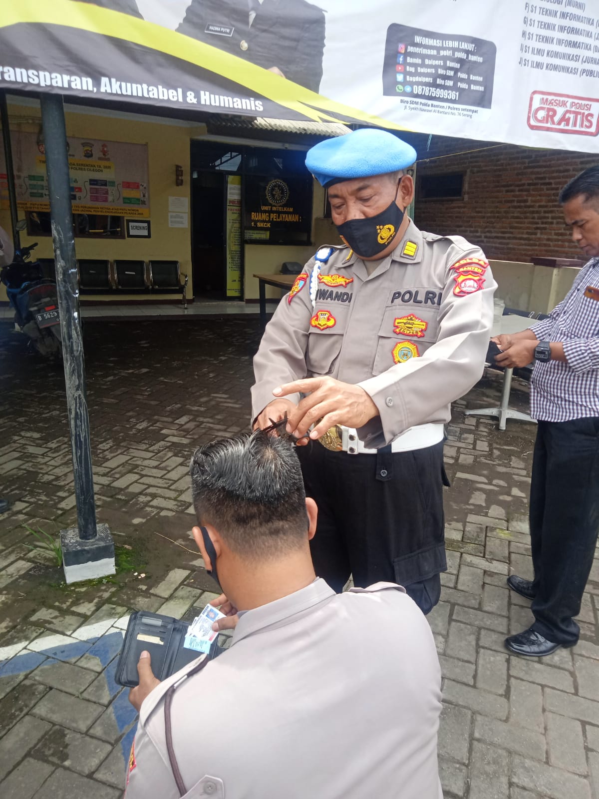ada satu anggota yang melanggar disiplin berambut gondrong akan tetapi kami langsung memverikan tindakan memotong rambut pelanggar dengan menggunakan gunting kemudian kami memberikan arahan kepada personel yang lain untuk tidak mencontoh hal tersebut,” tutur AKP Suwandi. (Bidhumas)