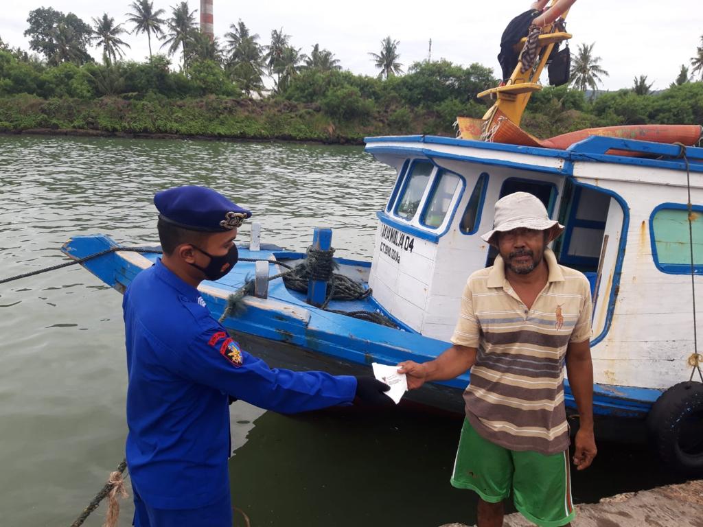 Personel Ditpolairud Polda Banten terus melakukan kegiatan bagi masker di Pelabuhan Paku Anyer pada Selasa (01/02).