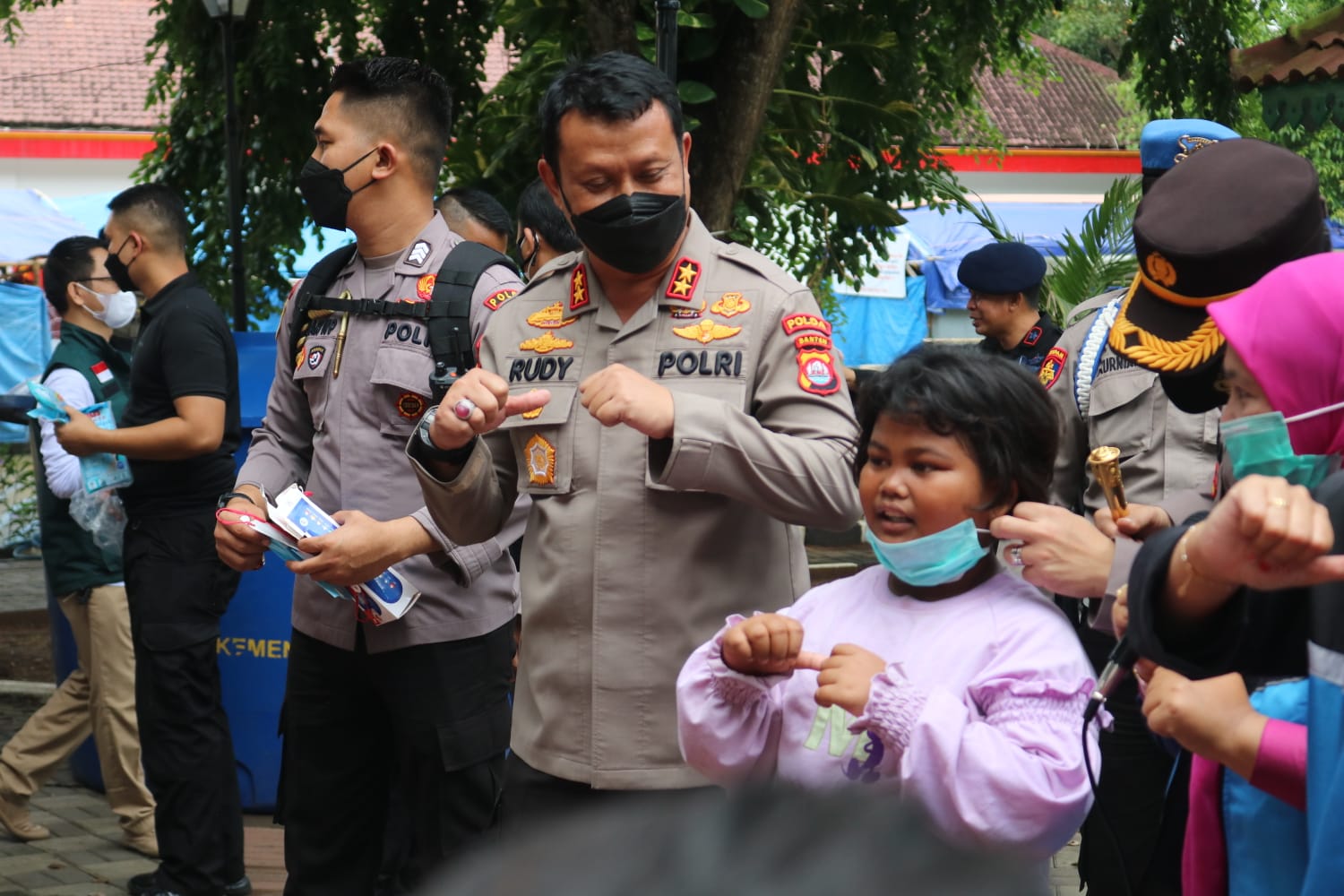 Sambil memberikan nasi kotak, Kapolda Banten menyapa anak-anak pengungsi di Banten Lama dan bermain ria untuk menghibur serta memberikan motivasi.