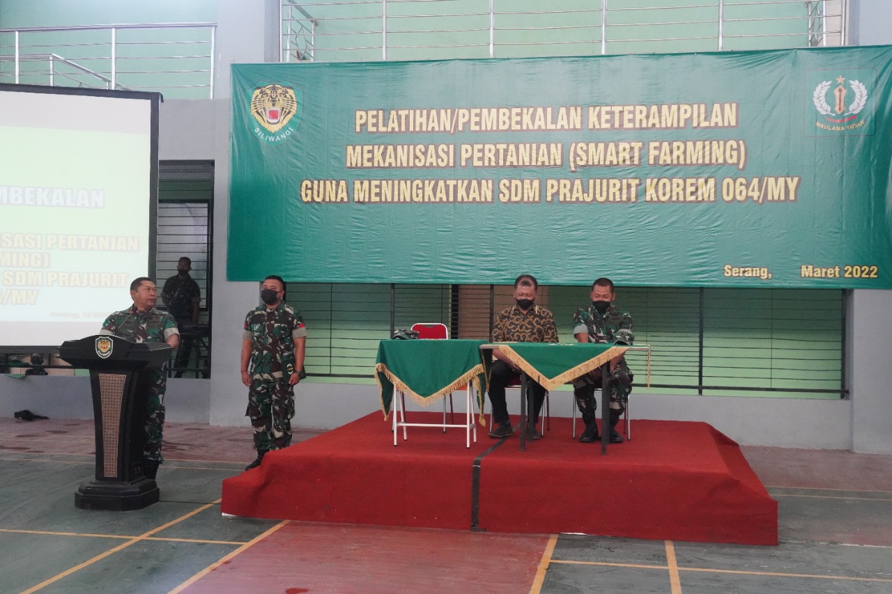 Korem 064/MY melaksanakan pelatihan pembekalan keterampilan mekanisasi pertanian atau disebut juga dengan Smart Farming, kegiatan tersebut adalah kerjasama antara Kodam lll/Siliwangi dengan BLK Lembang Bandung (Depnaker Rl). Pelatihan tersebut yaitu untuk meningkatkan sumber daya manusia bagi para prajurit di lingkungan Korem 064/MY, di buka pada tanggal 15 sampai dengan 16 Maret 2022. bertempat di Gor Maulana Yusuf Makorem 064/MY Jln Maulana Yusuf No 9 Kota Serang. Rabu ( 15/03/2022 )