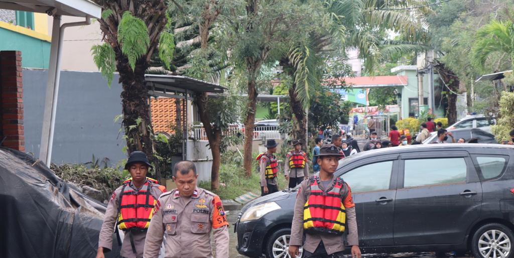 Tanpa menunggu lama, puluhan personel Satbrimob Polda Banten terjun langsung membantu warga sekitar Perumahan Padma Raya, Kaujon yang terkena musibah banjir bandang.