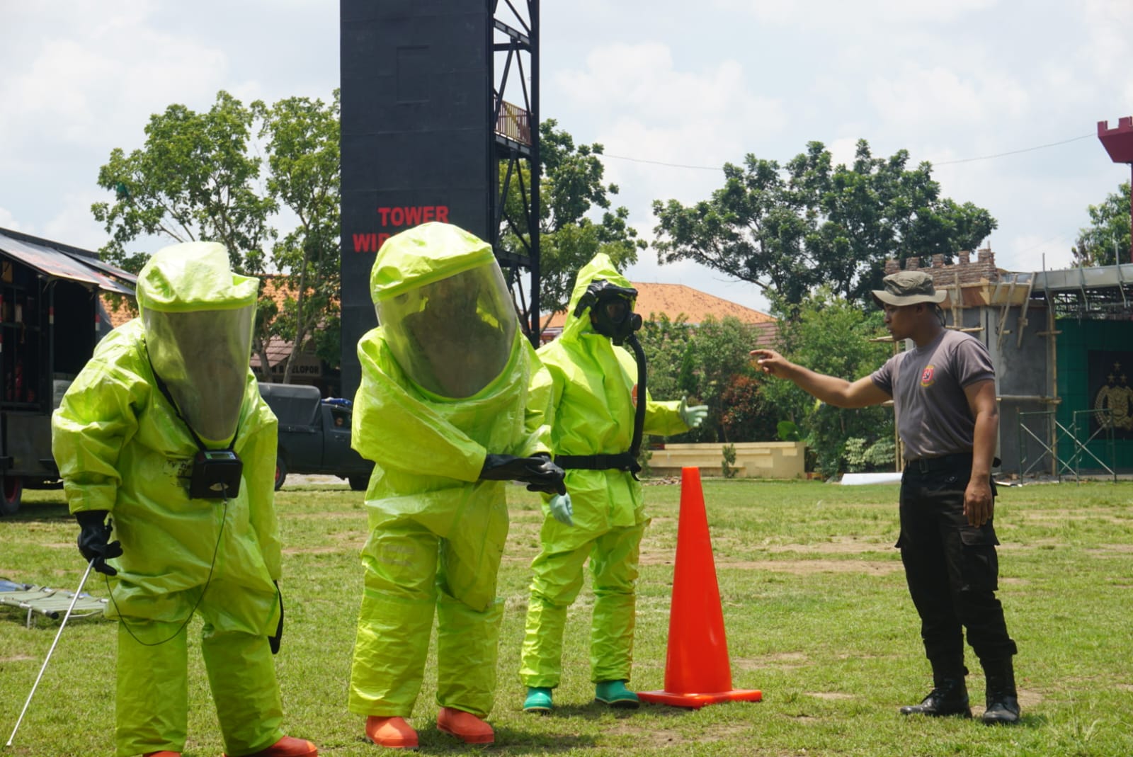 Komandan Detasemen Gegana Satuan Brimob Polda Banten AKBP Ndaru Istimawan memimpin langsung latihan peningkatan kemampuan kimia biologi dan radioaktif personel Detasemen Gegana Satbrimob Polda Banten di Lapangan Hijau Satbrimob.