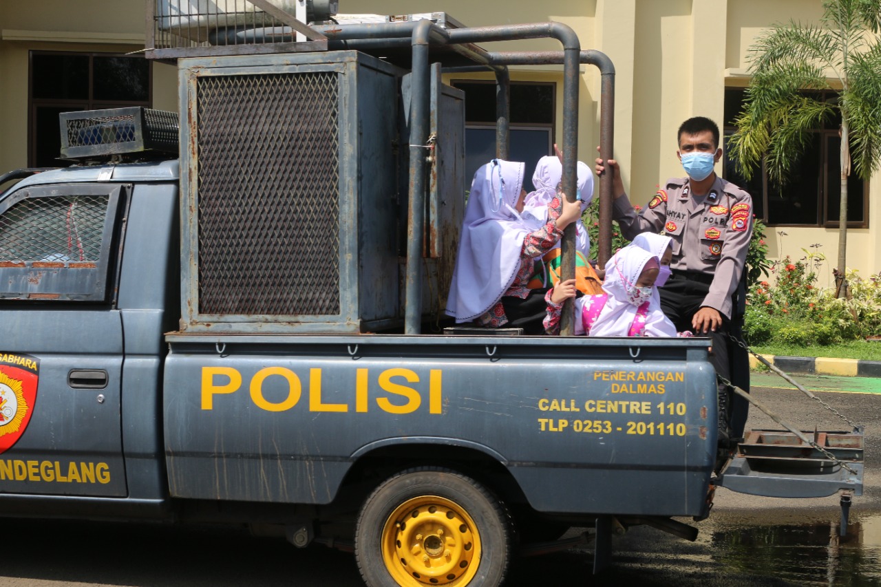 Mereka para siswa SD juga melihat langsung mobil patroli Sat Samapta Polres Pandeglang, Tak hanya itu, kegembiraan mereka semakin bertambah saat diajak naik mobil patroli polisi.
