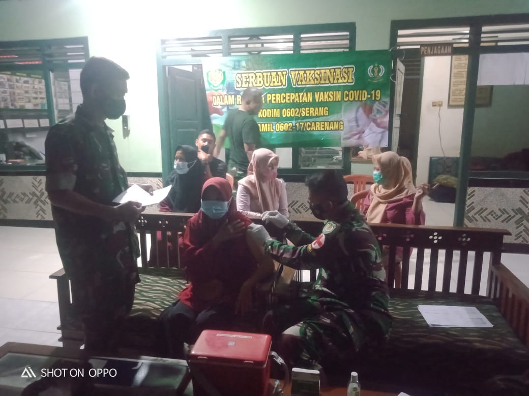 Danramil 0617/Carenang Kodim 0602/Serang Kapten Inf Rokhim menyampaikan bahwa, kegiatan vaksinasi akan terus dilaksanakan. Dimana kegiatan tersebut merupakan perintah langsung dari pimpinan yaitu Dandim 0602/Serang Kolonel Inf Susilo, S.Sos., untuk membantu pemerintah daerah mencegah penyebaran Virus Covid-19 di wilayah Kecamatan Carenang.