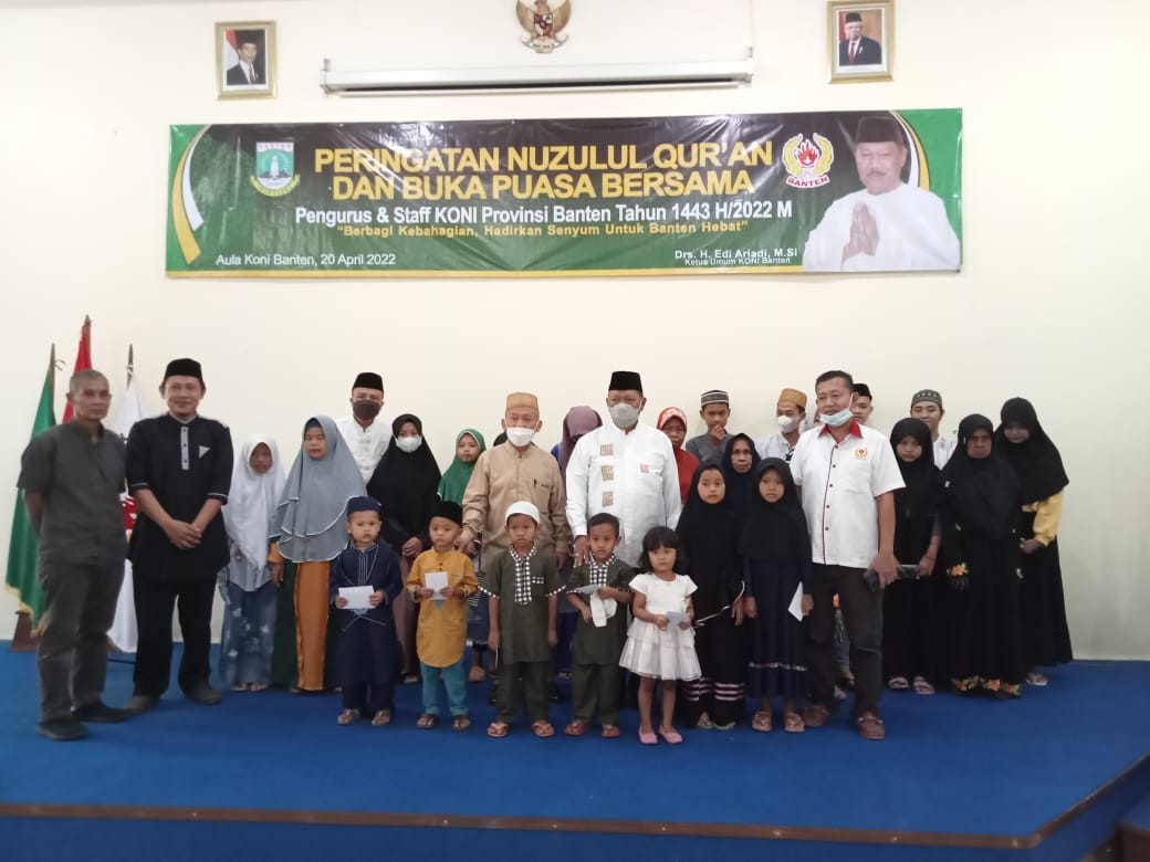 “Alhamdulillah di bulan Ramadhan ini KONI Banten dapat melaksanakan peringatan Nuzulul Qur’an dan buka puasa bersama serta santunan yatim piatu, semoga di bulan yang penuh berkah ini dapat memberikan kebahagiaan kepada seluruh umat manusia,” ucap Ketua KONI Provinsi Banten Edi Ariadi.