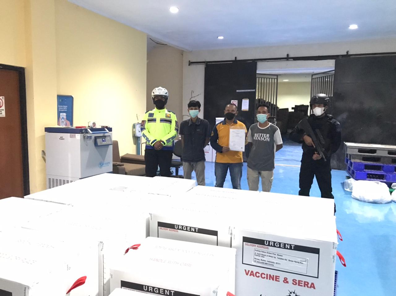 Dirlantas Polda Banten Kombes Pol Budi Mulyanto melalui Kasat PJR Ditlantas Polda Banten Kompol Adrian.S.Y.Tuuk mengatakan, “Personel Ditlantas melaksanakan pengawalan vaksin Covid-19 bergabung dengan Satbrimob Polda Banten sebanyak 1760 Vial Moderna dan 11.015 vial AZ Chadox-1 ke Gudang Farmasi Provinsi Banten yang berada di jalan Syekh Nawawi Albantani,”kata Adrian.S.Y.Tuuk.