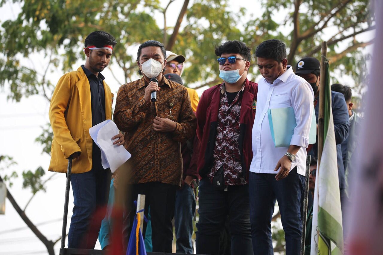 SERANG (suarasiber.co.id) – Sekretaris Daerah (Sekda) Provinsi Banten, Al Muktabar bersama Ketua DPRD Provinsi Banten Andra Soni menemui masa aksi mahasiswa dari beberapa Universitas yang tergabung dalam Badan Eksekutif Mahasiswa (BEM) Se-Banten.