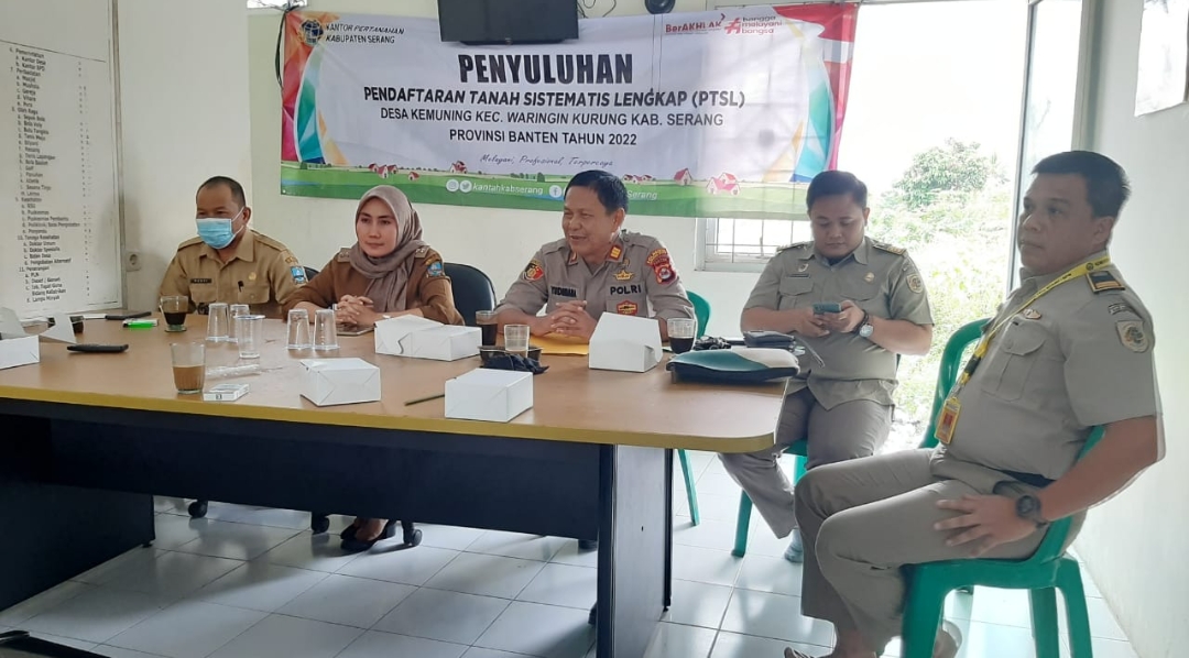 POLRES SERKOT,(Suarasiber.co.id) – Kapolsek Waringinkurung Polres Serkot Polda Banten AKP Engking Yudhiana beserta Bhabinkamtibmas Desa Kemuning Brigadir Frisma, menghadiri Penyuluhan Pendaftaran Tanah Sistematis Lengkap (PTSL) untuk tahun anggaran 2022, bertempat di Kantor Desa Kemuning Kecamatan Waringinkurung Kabupaten Serang. Senin (30/5/2022).