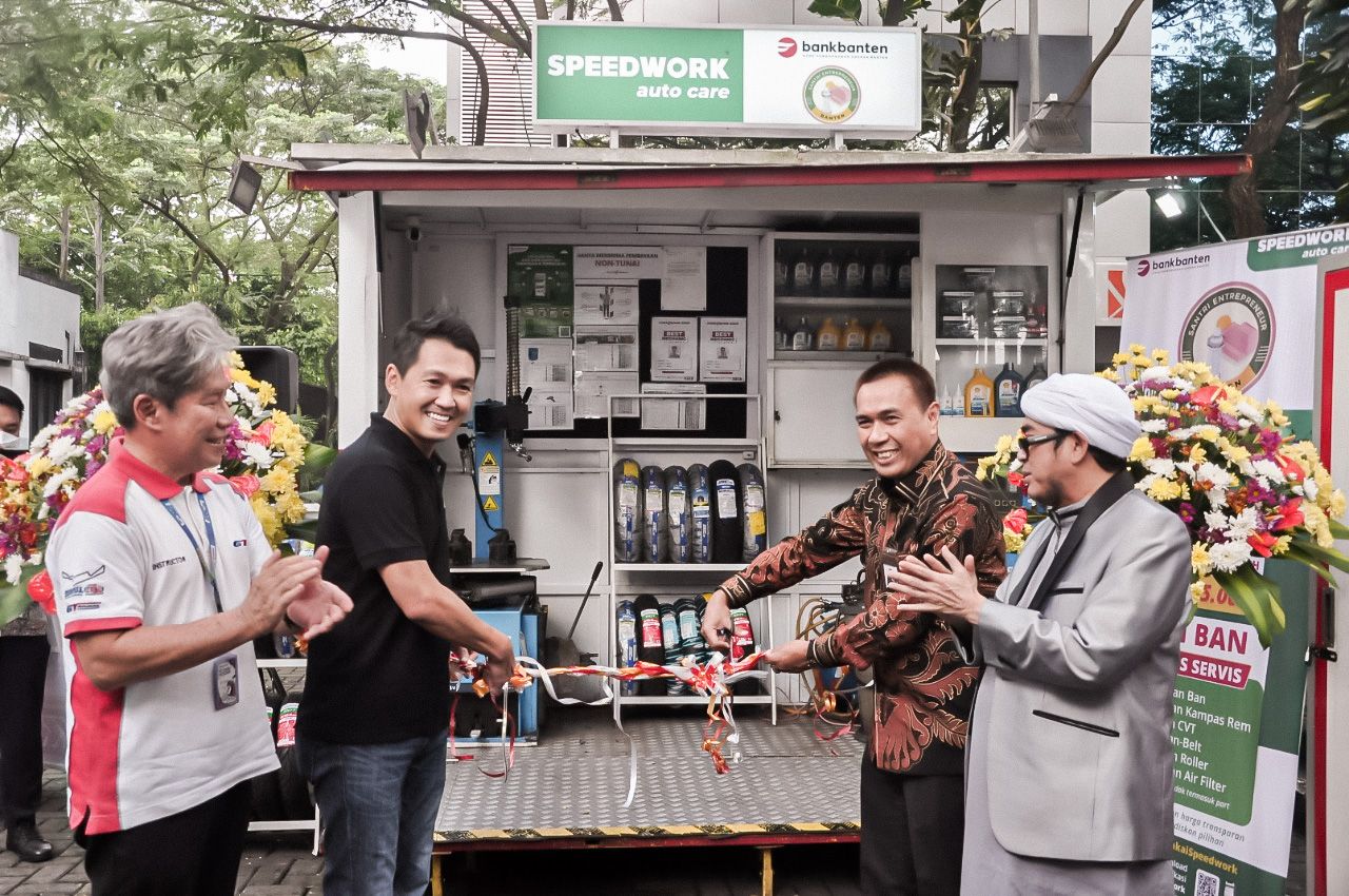 Speedwork, Foeryanto Jawoto dan Direktur Utama Bank Banten, Dr. Agus Syabarrudin beserta jajaran. Turut hadir Chief Operational Officer Speedwork, Bapak Handoko Said; GMSales Speedwork, Andry; Head of Division & Health Safety & Environment PT Gajah Tunggal Tbk, Joseph Landri; Pengasuh Pesantren Daaruttasbih, K.H Rafiudin dan Koordinator Unit Bisnis Pesantren Hayatusyarif, Robby Maualana. Pada kesempatan ini, Bank Banten juga meluncurkan Bengkel Speedwork yang berlokasi di Jl. M. Toha, Priuk Jaya – Tangerang sebagai pilot project dari Program Banten Santri Entrepreneur bersama Speedwork.