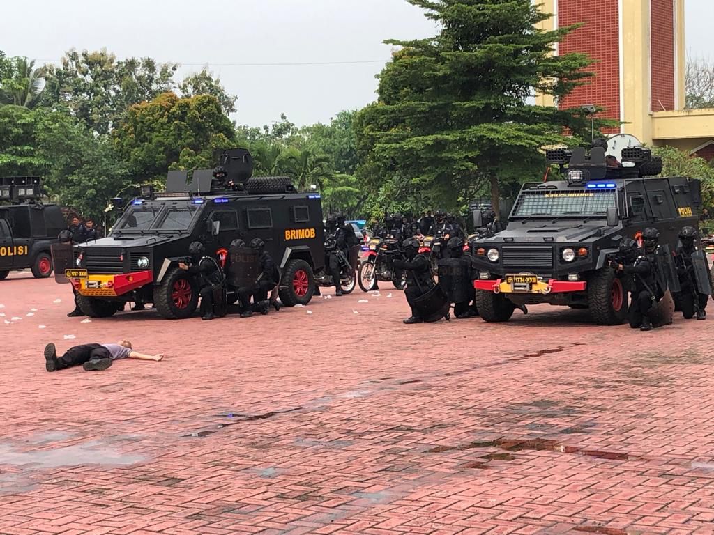 Serang,(Suarasiber.co.id) – Personel Satbrimob Polda Banten melaksanakan Gladi Simulasi Sispam Kota Bersama Ditsamapta di Lapangan depan Mapolda Banten, semakin memantapkan persiapannya dalam menghadapi pesta demokrasi, berbagai upaya pengamanan telah dipersiapkan sedini mungkin telah dilaksanakan latihan lintas ganti dalmas Ditsamapta Polda Banten bersama Pasukan Huru Hara (PHH) Sat Brimobda Banten pada Jumat (24/6)