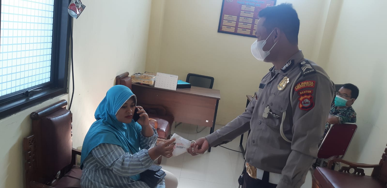 Anggota Polsek Cipocok Jaya Polresta Serkot Brigpol Herli Berikan masker kepada tamu polsek untuk memastikan Prokes masih berjalan di wilayah hukum Cipocok Jaya Kota Serang .