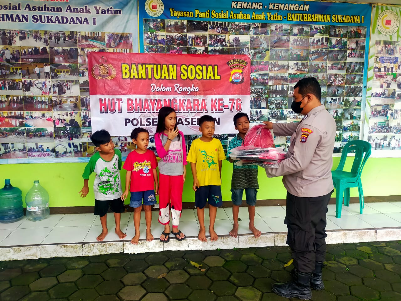 “dalam rangkai menyambut HUT Bhayangkara ke 76, Polsek Kasemen Polresta Serkot gelar santunan anak yatim dengan memberikan tas sekolah dan alat tulis kepada anak yatim di yayasan Baiturrahman Kasemen”kata AKP Ugum.