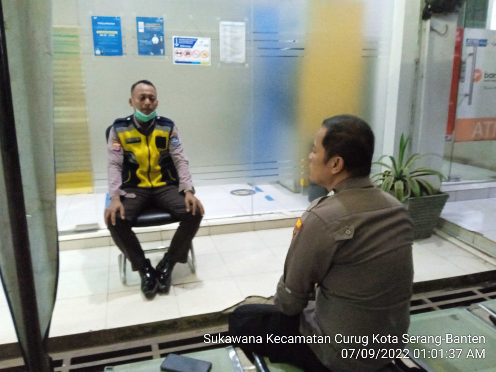Dalam giat ini, anggota Polsek Curug Polresta Serkot Bripka Aris H,SH. dan Bripka Ikhsan,SH. memberi arahan dan pesan-pesan Kamtibmas kepada Security Bank serta mengingatkan tentang Prokes dan kesiap siagaan saat bertugas antisipasi kejahatan.