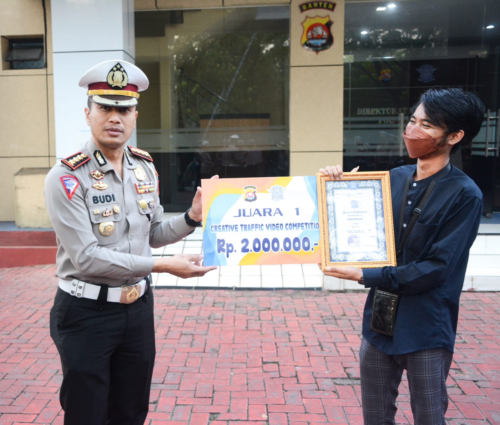 Setelah pelaksanaan apel pagi Dirlantas Polda Banten Kombes Pol Budi Mulyanto didampingi oleh Wadirlantas Polda Banten AKBP Alfaris Pattiwael memberikan piagam dan hadiah kepada pemenang Juara Lomba Creative Traffic Video Competition yang diselenggarakan oleh Ditlantas Polda Banten. (Bidhumas).