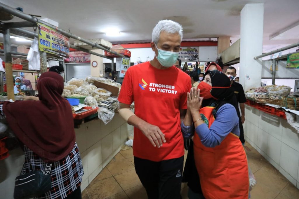 “Kepriwe regane, pada mundak ora (bagaimana harga-harga, pada naik tidak). Minyak goreng mbok wis akeh, regane esih larang apa ora (minyak goreng sudah banyak ya, harganya masih mahal tidak?)” tanya Ganjar ke pedagang.