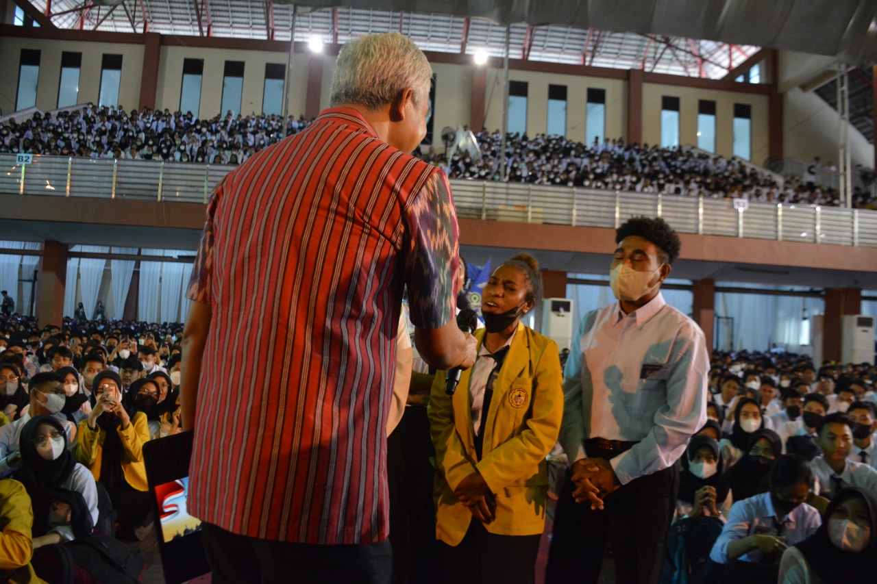 Salah satu mahasiswa asal Papua Ika mengaku memiliki alasan untuk menjadi guru setelah melepas pendidikan di unsoed untuk memajukan pendidikan di daerahnya ketika diajak berbincang oleh Ganjar.