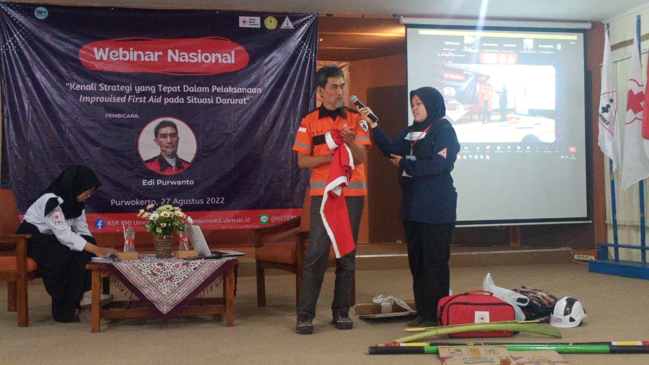 Korps Sukarela (KSR) PMI universitas Jenderal Sudirman Purwokerto mengadakan “Webinar Nasional Kenali Strategi yang Tepat dalam Pelaksanaan Improvised First Aid dalam Situasi Darurat” Sabtu 27 Agustus 2022. Kegiatan bertujuan untuk mengedukasi kepada para relawan agar mempunyai kemampuan merespon secara efektif pertolongan pertama dalam situasi krisis.