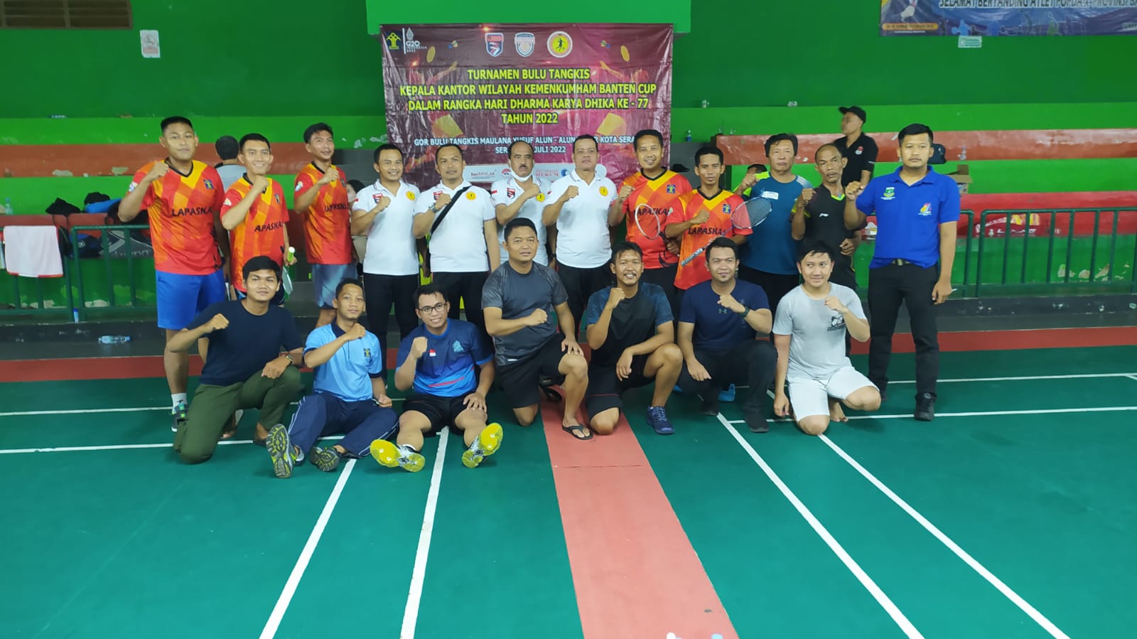 SERANG,(suarasiber.co.id)- Semarak Gelaran Peringatan Hari Kemerdekaan sekaligus dalam rangka memperingati Hari Dharma Karya Dhika ke-77 tahun 2022 nampak terlihat di lingkungan Kantor Wilayah Kementerian Hukum dan HAM, salah satu cabang olahraga (Cabor) Badminton turut dilangsungkan, dimana tim kontingen atlet Lapas kelas III Rangkasbitung berhasil menyabet medali emas pada cabor bulu tangkis piala Kakanwil Cup 2022 yang bertempat di Gor Alun-Alun Kota Serang.