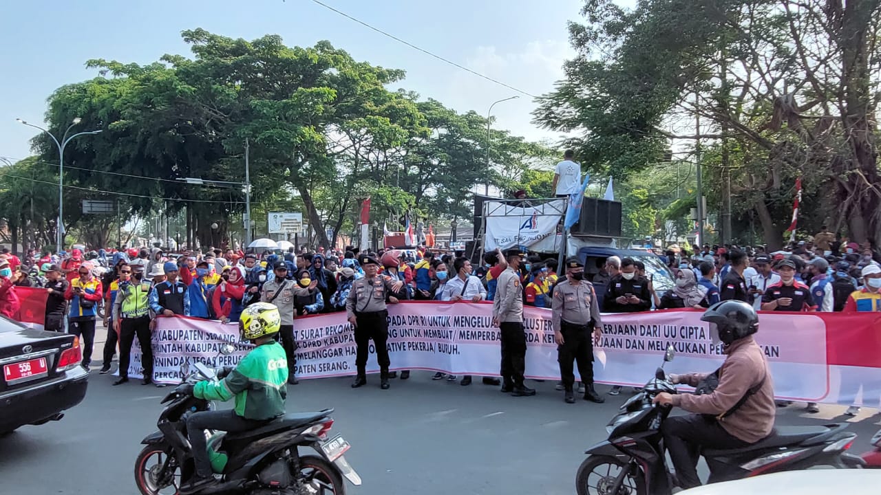 Asep Saefullah, korlap demo menyatakan demo menyuarakan tiga tuntutan. Pertama, mendesak DPRD Kabupaten Serang agar membuat surat rekomendasi kepada DPR RI untuk mengeluarkan cluster ketenagakerjaan dari UU Cipta Kerja No 11 Thn 2020 Cipta Kerja.