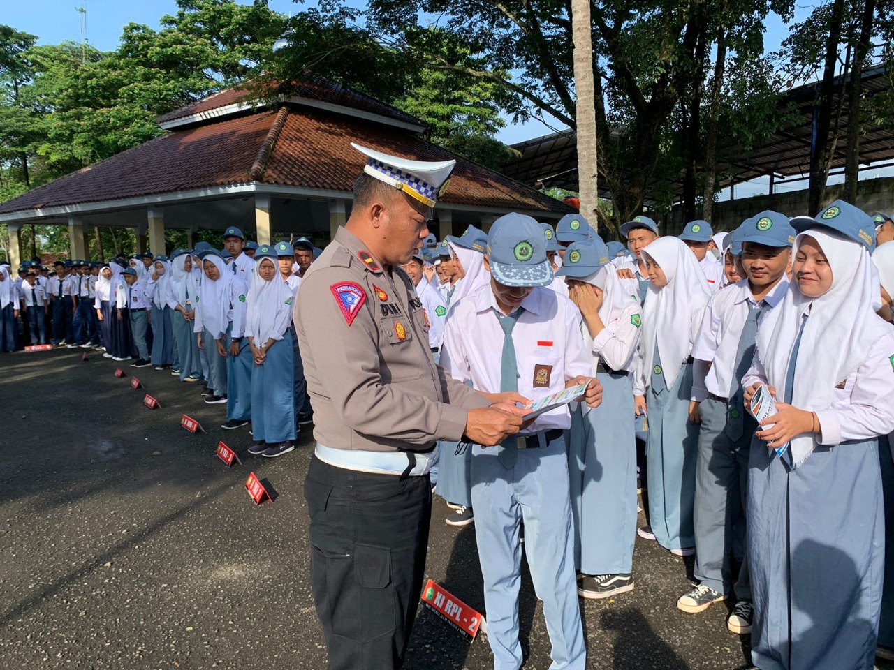“Personil Sat Lantas memberikan himbauan tertib dalam berlalu lintas kepada para pelajar Siswa SMK MHI (Mulia Hati Insani) Warunggunung sekaligus membagikan brosur keselamatan berlalulintas kepada para pelajar usia 12-16 tahun,” ungkapnya.