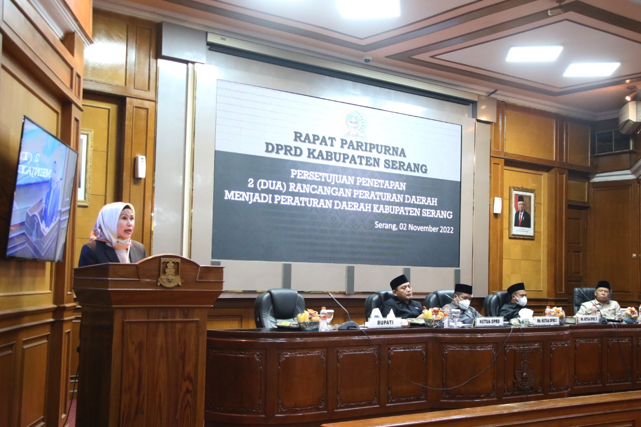 Penetapan terungkap pada Rapat Paripurna DPRD Kabupaten Serang Persetujuan Penetapan 2 macam Rancangan Peraturan Daerah menjadi Perda Kabupaten Serang di gedung DPRD setempat pada Rabu, 2 Oktober 2022. Rapat paripurna di pimpin oleh Ketua DPRD Bahrul Ulum, tiga Wakil Ketua, dihadiri puluhan anggota dewan.