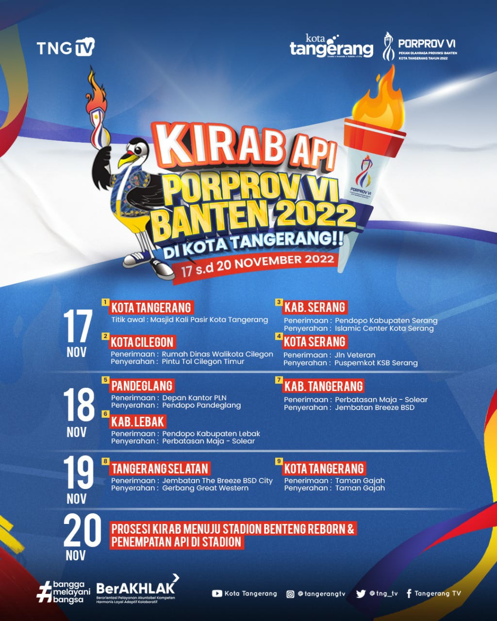“Pada hari berikutnya yaitu 19 November, Kirab Api Porprov akan ke Kota Tangerang Selatan. Setelah diterima di Jembatan The Breeze BSD City akan diserahkan ke Kota Tangerang di Gerbang Great Western. Taman Gajah akan menjadi lokasi serah terima Kota Tangerang untuk selanjutnya prosesi kirab menuju Stadion Benteng Reborn dan penempatan api di Stadion,” jelasnya.