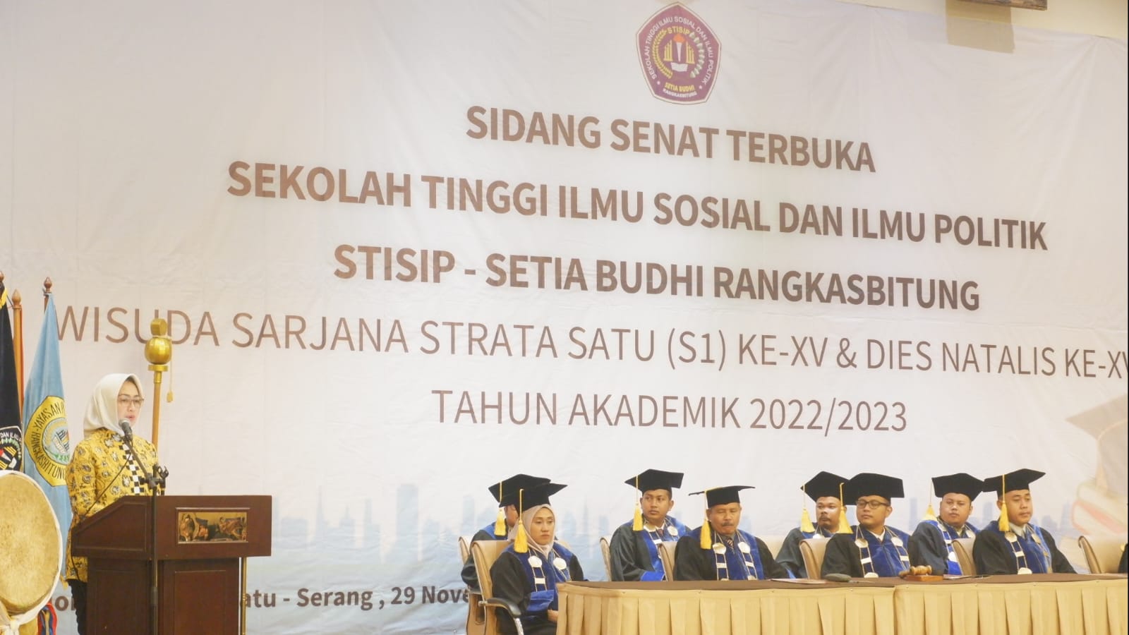 Serang, (suarasiber.co.id) – Mantan walikota Tangerang Selatan Airin Rachmi Diany berkesempatan menjadi pengisi orasi ilmiah pada Wisuda Sarjana XV Sekolah Tinggi Ilmu Sosial san Ilmu Politik (STISIP) Setia Budhi Rangkasbitung di Hotel Horison Ultima Ratu, Kota Serang, Selasa (29/11/2022). Airin memberikan banyak motivasi agar para mahasiswa yang diwisuda bersiap untuk lebih bermanfaat bagi masyarakat.