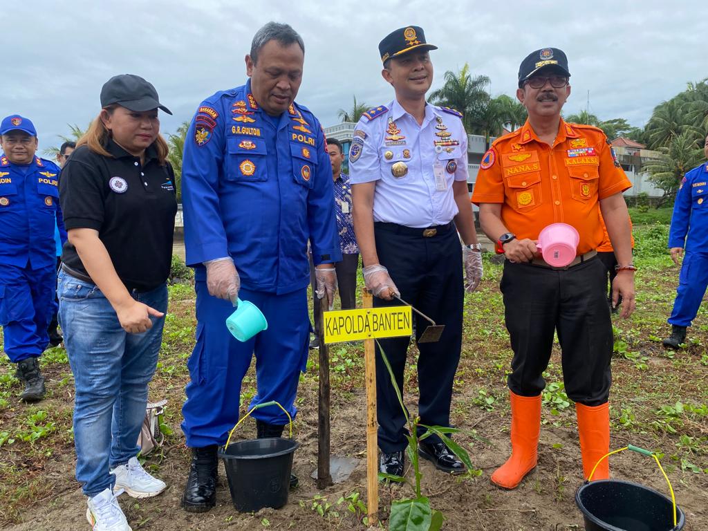 Serang, (suarasiber.co.id) – Menyambut Hari Jadi Polairud Ke – 72, Dirpolairud Polda Banten Kombes Pol Giuseppe Reinhard Gultom bersama unsur maritim provinsi banten melaksanakan penanaman seribu pohon butun atau Barringtonia Asiatica Kurz disepanjang pantai wilayah Anyer Cinangka dan Carita pada Kamis (17/11).