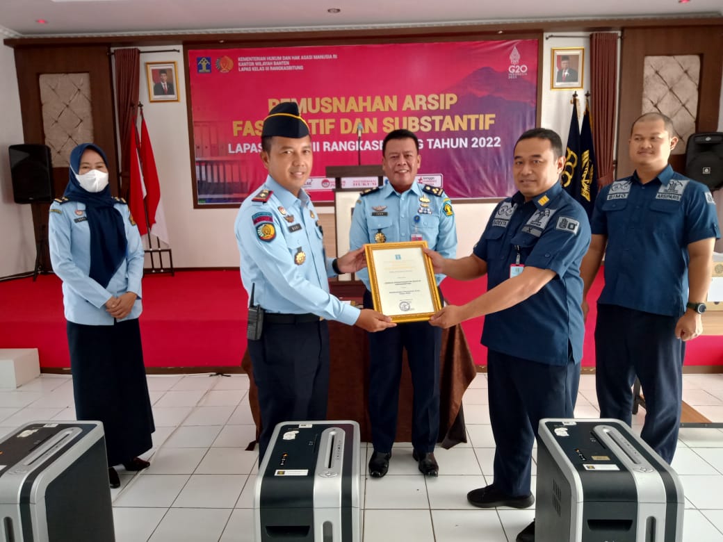 Piagam Penghargaan ini diberikan kepada Kepala Lapas Rangkasbitung oleh Arsiparis Ahli Muda Setjen Kemenkumham RI disaksikan langsung oleh Kepala Divisi Pemasyarakatan Kanwil Kemenkumham Banten atas pelaksanaan pemusnahan kurang lebih 810 (delapan ratus sepuluh) arsip fisik substantif Lapas Rangkasbitung yang dilaksanakan pada bulan Desember 2020.