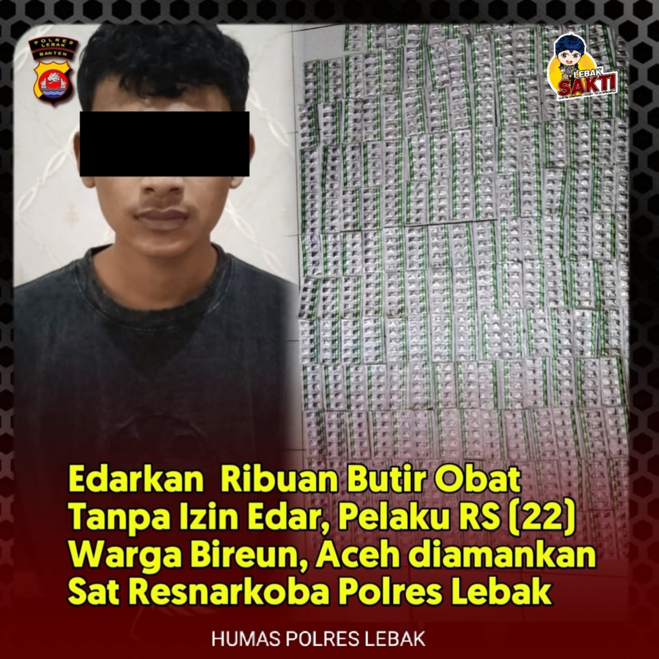 Lebak, (suarasiber.co.id) – Resnarkoba Polres Lebak Polda Banten berhasil mengamankan Pelaku RS (22) warga Kabupaten Bireun Aceh pada Senin (17/12/2022) setelah kedapatan mengedarkan Ribuan butir Obat Tanpa Izin Edar di Wilayah Kabupaten Lebak.